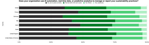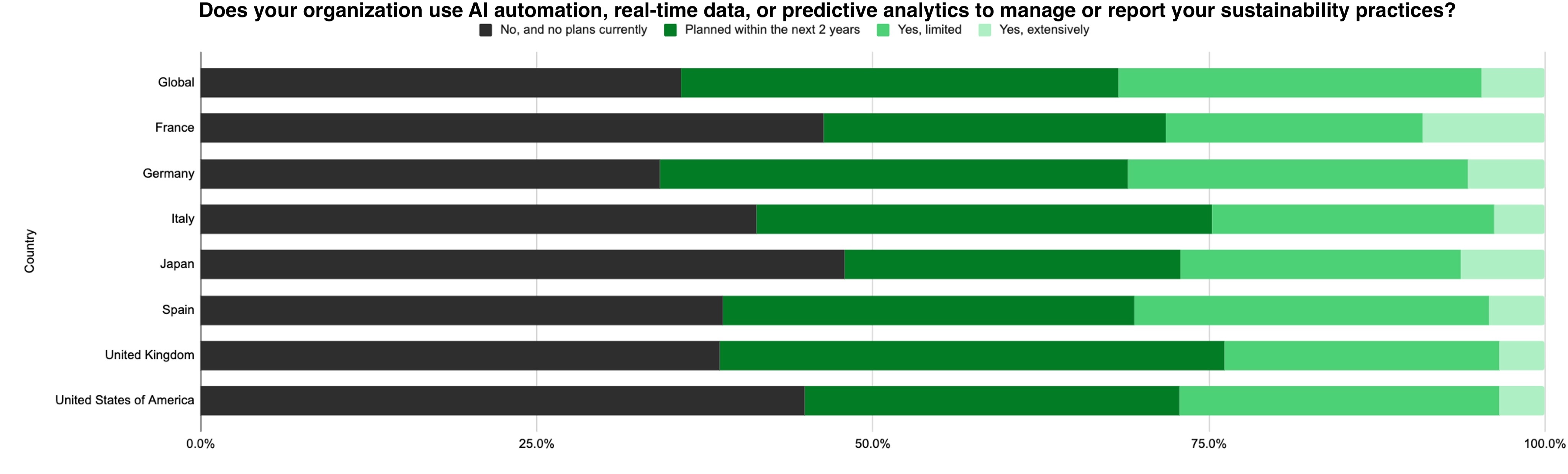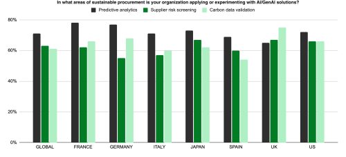 Während global 71 % der Unternehmen Lieferantenanalysen nutzen, sind es in Deutschland 77 %. Bei der Risikoüberwachung von Lieferanten nutzen global 63 % der Unternehmen künstliche Intelligenz, in Deutschland lediglich 55 %. Bei der Validierung von CO2-Daten nutzen global 61 % der befragten Unternehmen Künstliche Intelligenz, in Deutschland nutzen hingegen 68 % KI dafür.