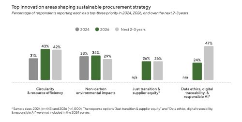 Das Sustainable Procurement Barometer 2026 zeigt außerdem eine weltweite Annäherung bei drei Kernthemen: Netto-Null und CO2-Management, Arbeitspraktiken bei Lieferanten sowie Zirkularität und Ressourceneffizienz. In anderen Nachhaltigkeitsprioritäten zeigen sich jedoch regionale Unterschiede, die auf verschiedene regulatorische und marktbezogene Entwicklungen zurückzuführen sind.
